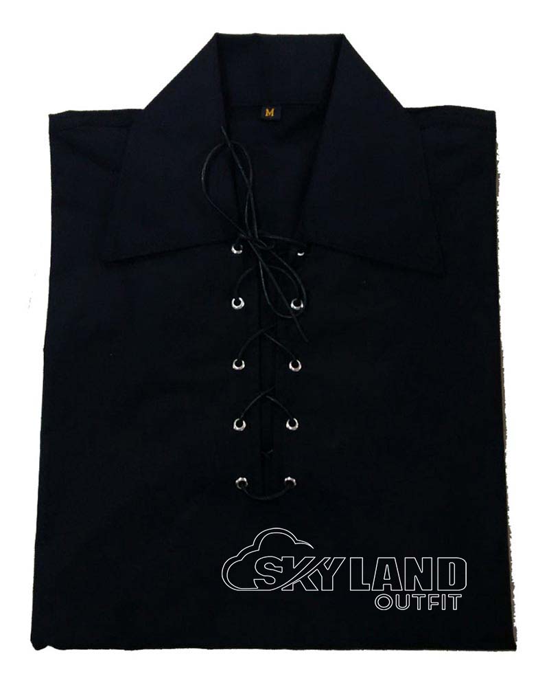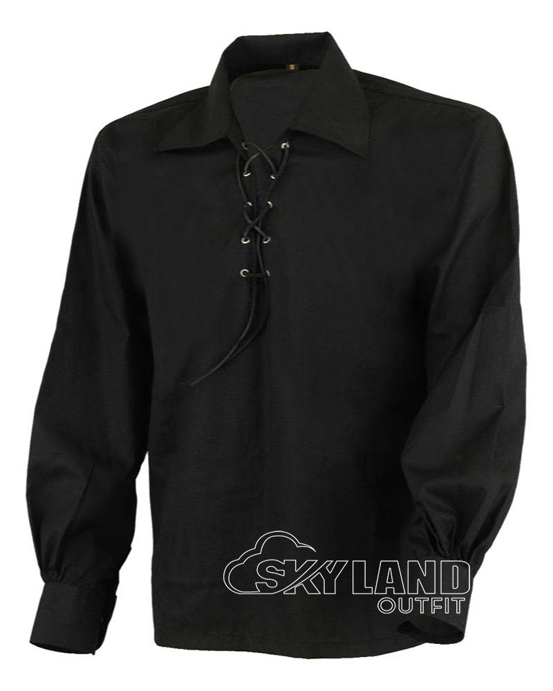 Moreover, the shirt includes a signature Jacobean lace-up front. It features a leather cord and metal eyelets. In addition, wide relaxed sleeves and a lapel collar offer unrestricted movement. So, it layers flawlessly under tartan kilts or utility kilts.