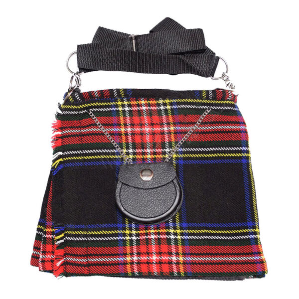 Add a touch of Scotland to your wardrobe with the Black Stewart Tartan Ladies Kilt Shaped Purse. Designed in the famous Black Stewart tartan, this elegant tote bag combines traditional charm with modern functionality. Its kilt-inspired shape, detailed pleats, and decorative buckle accents make it a standout accessory for any outfit.