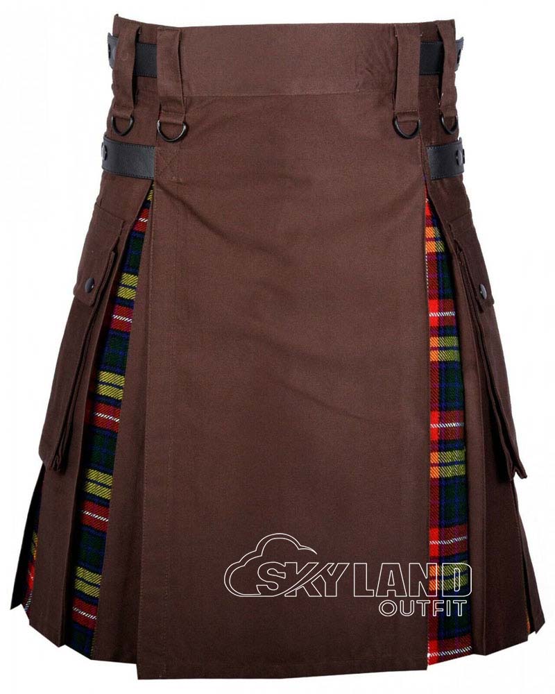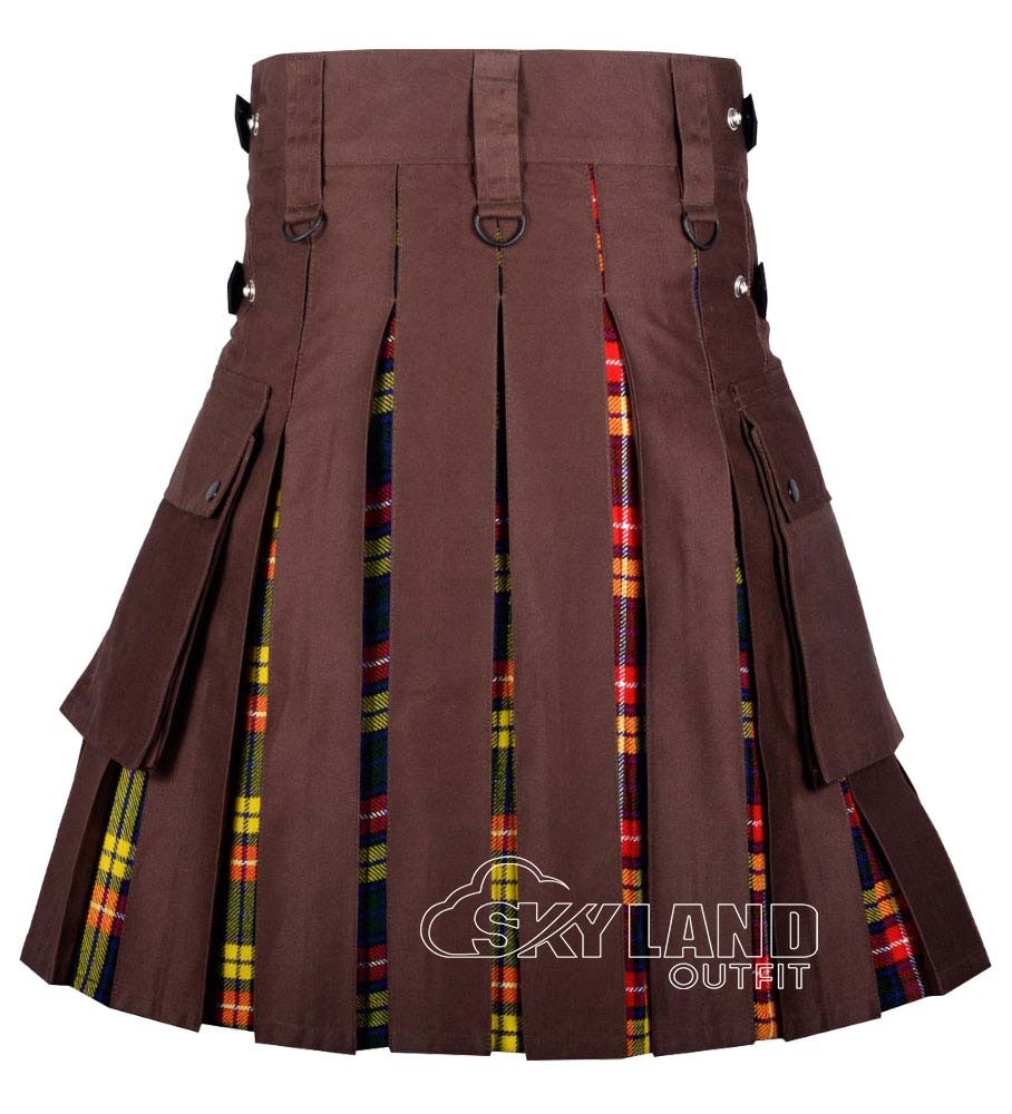 Add vibrant clan energy and everyday comfort with our Hybrid Utility Kilts – Brown Cotton & Buchanan Tartan Kilt. This kilt merges bold Scottish tradition and practical utility. It features durable brown cotton for the main body. Authentic Buchanan tartan (asymmetrical pattern with dominant yellow, red, green, navy blue, white, and black – brilliant colors symbolizing nobility/generosity in yellow, courage in red, growth in green, and depth in navy/black) accents the pleats. Therefore, it creates a striking, eye-catching contrast full of heritage pride.