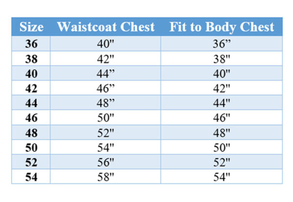 | Chest size | 34 inches / 86.36 cm, 36 inches / 91.44 cm, 38 inches / 96.52 cm, 40 inches / 101.60 cm, 42 inches / 106.68 cm, 44 inches / 111.76 cm, 46 inches / 116.84 cm, 48 inches / 121.92 cm, 50 inches / 127.00 cm, 52 inches / 132.08 cm, 54 inches / 137.16 cm, 56 inches / 142.24 cm |