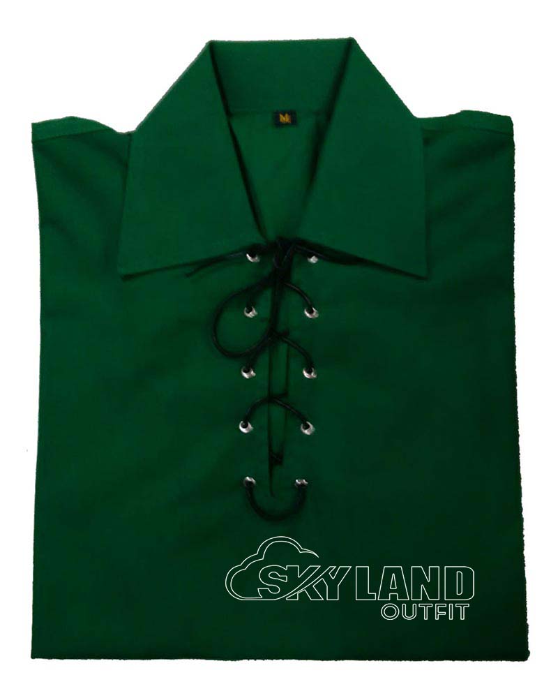 Moreover, the shirt includes a classic Jacobean lace-up front. It uses a leather cord and metal eyelets. In addition, wide relaxed sleeves and a lapel collar allow free movement. So, it pairs smoothly with tartan kilts or utility kilts.