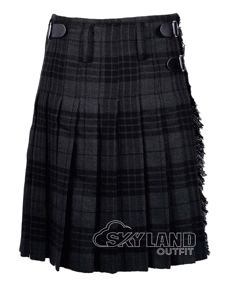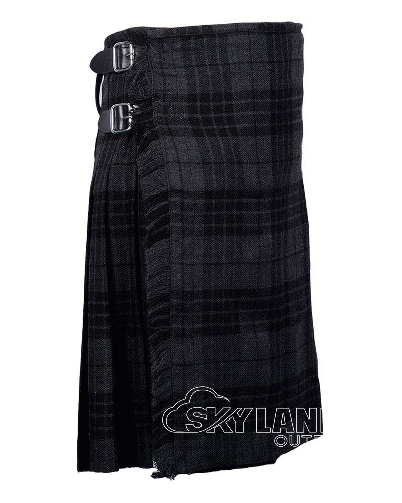 The Grey Watch Tartan 8 Yard Kilt blends Scottish tradition with premium craftsmanship. Made from a wool blend, this traditional Scottish kilt for men features deep knife pleats, adjustable leather straps, and a mid-knee fit. Perfect for weddings, Highland games, and formal occasions.
