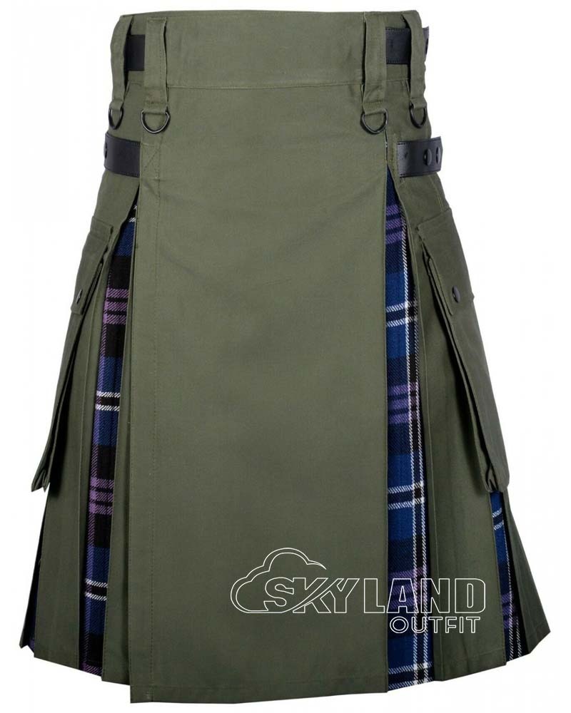 Blend rich olive tones with timeless national pride in our Hybrid Utility Kilts – Oliver Green & Heritage of Scotland Tartan Kilt. This kilt unites natural cotton ruggedness and iconic Scottish heritage. It features durable Oliver Green cotton for the main body. Authentic Heritage of Scotland tartan (navy blue base interwoven with purple, black, and thin white lines forming squares – the classic, elegant pattern symbolizing Scotland’s enduring legacy and craftsmanship) accents the pleats. Therefore, it creates a refined, sophisticated contrast full of patriotic depth.
