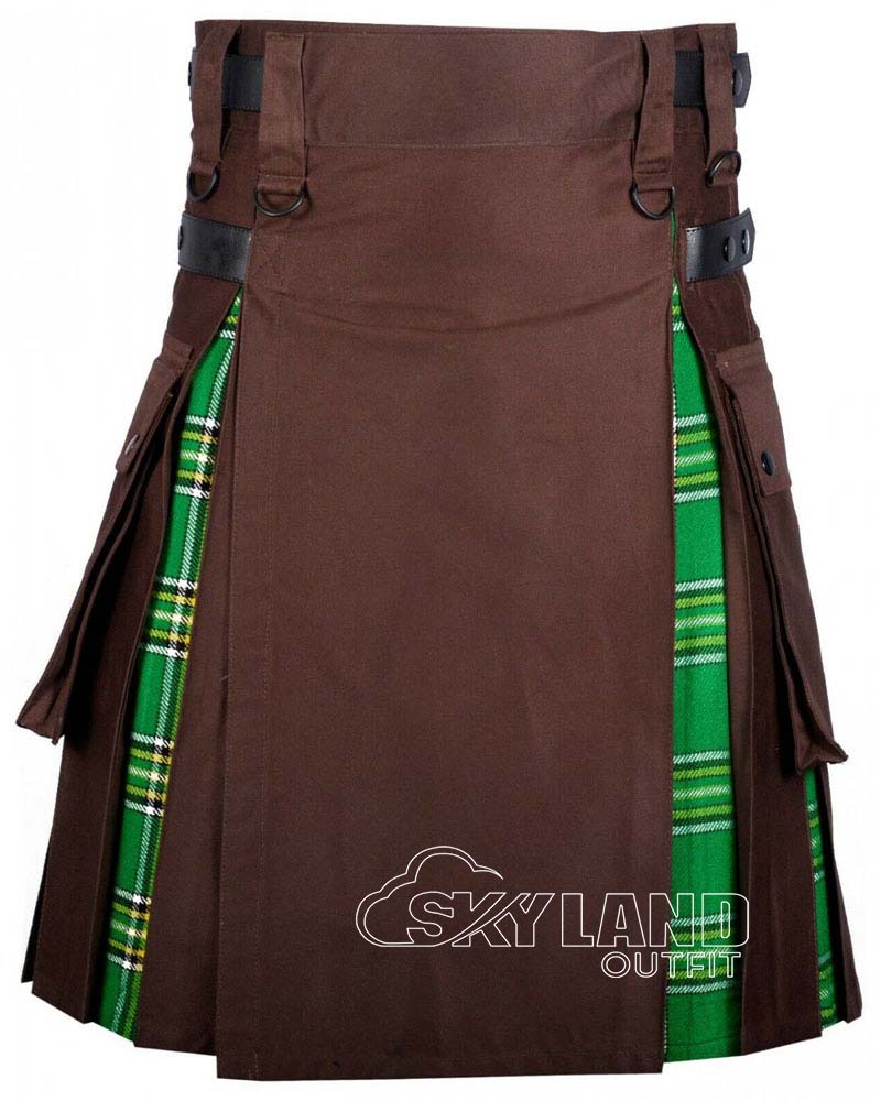 Celebrate Celtic roots with natural comfort and everyday utility in our Hybrid Utility Kilts – Brown Cotton & Irish Heritage Tartan Kilt. This kilt blends earthy design and powerful Irish symbolism. It features durable brown cotton for the main body. Authentic Irish Heritage tartan (vibrant green base with black and white accents – representing Ireland’s lush landscapes, historical endurance, and hopeful future) accents the pleats. Therefore, it delivers a rich, meaningful contrast full of cultural pride.