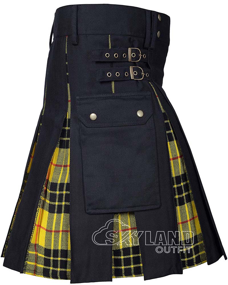 Make a powerful statement with clan pride and everyday utility in our MacLeod of Lewis Tartan & Black Cotton Kilt Hybrid Utility Kilts. This kilt fuses iconic heritage and modern practicality. It features premium black cotton for the main body. Authentic MacLeod of Lewis tartan (striking yellow and black base with thin red lines – the legendary “Loud MacLeod”) accents the pleats. Therefore, it delivers high-visibility impact and historical depth.