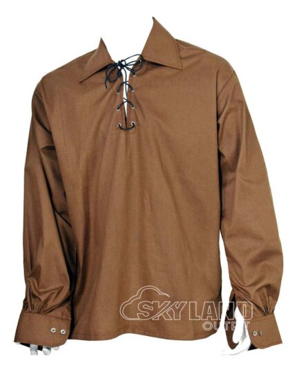 Moreover, the shirt includes a classic Jacobean lace-up front. It features a leather cord and metal eyelets. In addition, it has a lapel collar and drawstring accents for customizable fit. So, it layers smoothly with tartan kilts or utility kilts.