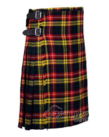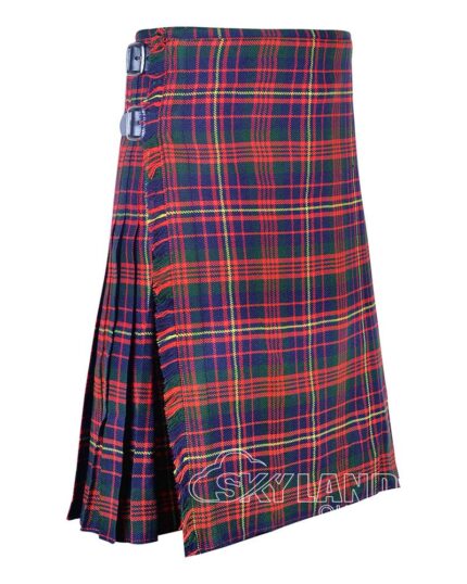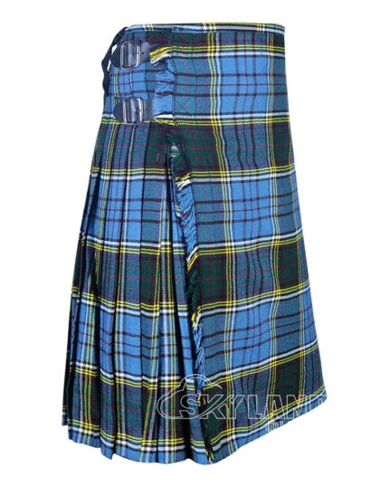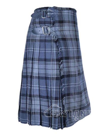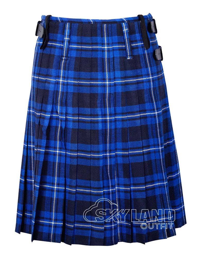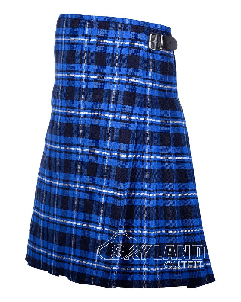The Ramsey Blue Tartan 8 Yard Kilt blends Scottish tradition with premium craftsmanship. Made from a wool blend, this traditional Scottish kilt for men features deep knife pleats, adjustable leather straps, and a mid-knee fit. Perfect for weddings, Highland games, and formal occasions.