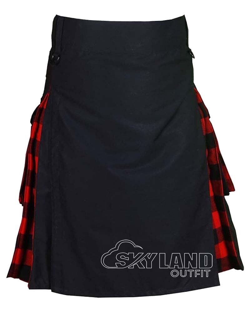 Capture legendary Highland spirit with practical edge in our Hybrid Utility Kilts – Black Cotton & Red Black Rob Roy Tartan Kilt. This kilt merges iconic tradition and modern utility. It uses premium black cotton for the main body. Authentic Red Black Rob Roy tartan (bold red and black check in equal proportions – the timeless, high-contrast pattern tied to Rob Roy MacGregor) accents the pleats. Therefore, it delivers striking visual impact and historical depth.