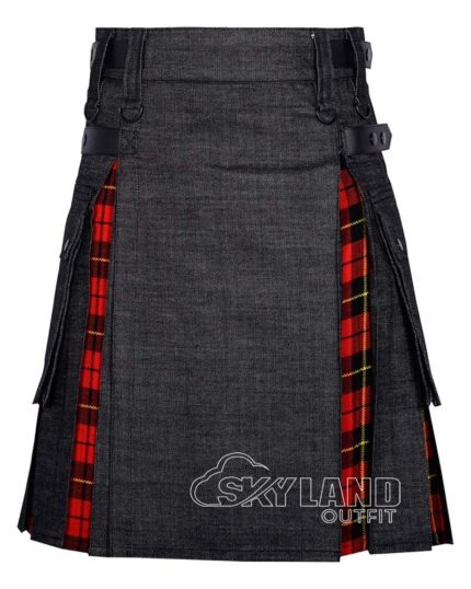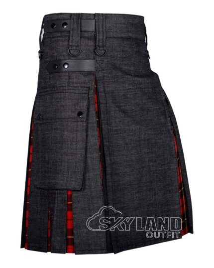 Command attention with royal heritage and everyday utility in our Hybrid Utility Kilts – Black Cotton & Royal Stewart Tartan Kilt. This kilt fuses legendary tradition and modern practicality. It features premium black cotton for the main body. Authentic Royal Stewart tartan (bold red base interwoven with green, navy blue, white, and yellow accents) accents the pleats. Therefore, it delivers the most iconic Scottish pattern, symbolizing bravery (red), woodlands (green), waters (blue), and hope/prosperity (yellow).