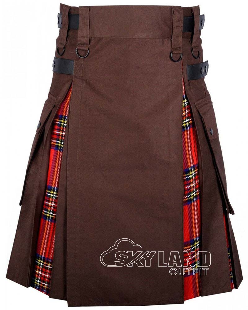 Bring iconic royal flair to everyday comfort with our Hybrid Utility Kilts – Brown Cotton & Royal Stewart Tartan Kilt. This kilt unites legendary Scottish tradition and natural practicality. It features durable brown cotton for the main body. Authentic Royal Stewart tartan (bold red base interwoven with green, navy blue, white, and yellow accents) highlights the pleats. Therefore, it showcases the world’s most recognizable tartan pattern, symbolizing bravery (red), woodlands (green), Scotland’s waters (blue), and hope/prosperity (yellow).